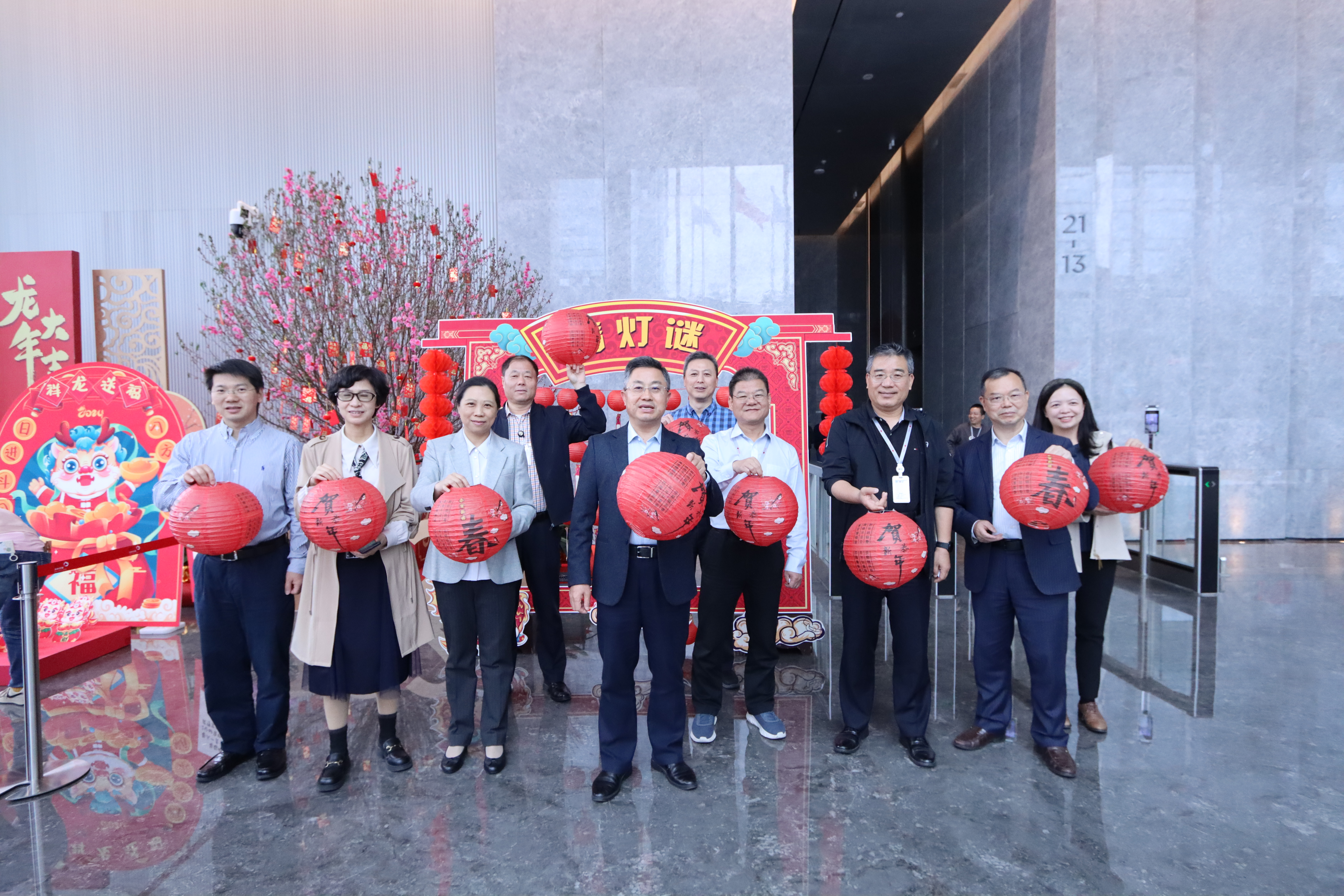 2月23日,深科技總部大堂流光溢彩,春味濃郁,一場熱鬧喜慶的元宵燈謎會精彩呈現。公司黨委書記、董事長韓宗遠,黨委委員、高級副總裁周庚申,高級副總裁于化榮,黨委委員、高級副總裁莫尚云,監事會主席肖澗毅,黨委委員、總裁助理曹岷、周浩、彭秧,董事會秘書鐘彥及工會副主席邱勝來到活動現場與廣大員工一起猜燈謎、賞花燈、玩游戲,共同慶祝元宵佳節。中國電子專職董事、深科技董事劉漢清應邀參加。
